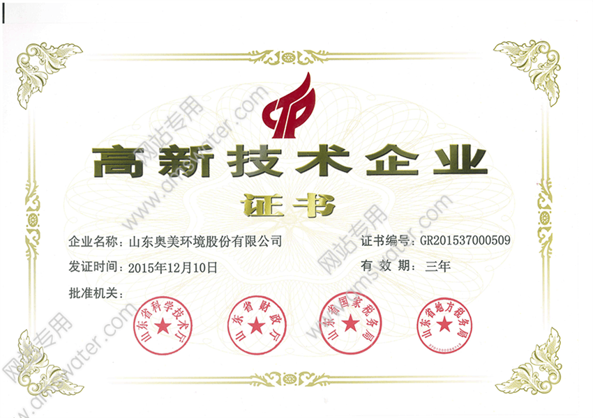 山東奧美環(huán)境股份有限公司(以下簡(jiǎn)稱“公司”)于2016年3月30日收到了由山東省科學(xué)技術(shù)廳、山東省財(cái)政廳、山東省國(guó)家稅務(wù) 局、山東省地方稅務(wù)局聯(lián)合頒發(fā)的《高新技術(shù)企業(yè)證書》。公司取得 的高新技術(shù)企業(yè)證書編號(hào):GR201537000509,發(fā)證時(shí)間:2015 年 12 月 10 日,有效期:三年。